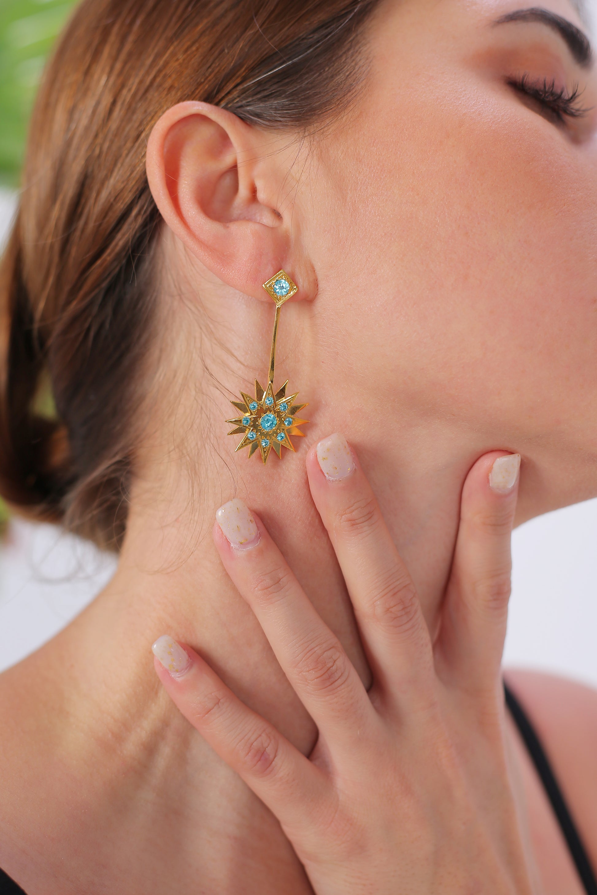 A true masterpiece embodying celestial elegance, designed in the shape of a three-dimensional star radiating with the glow of the sky, centered with natural aqua marine stones in a serene blue hue to evoke a sense of purity, balance, and feminine grace.