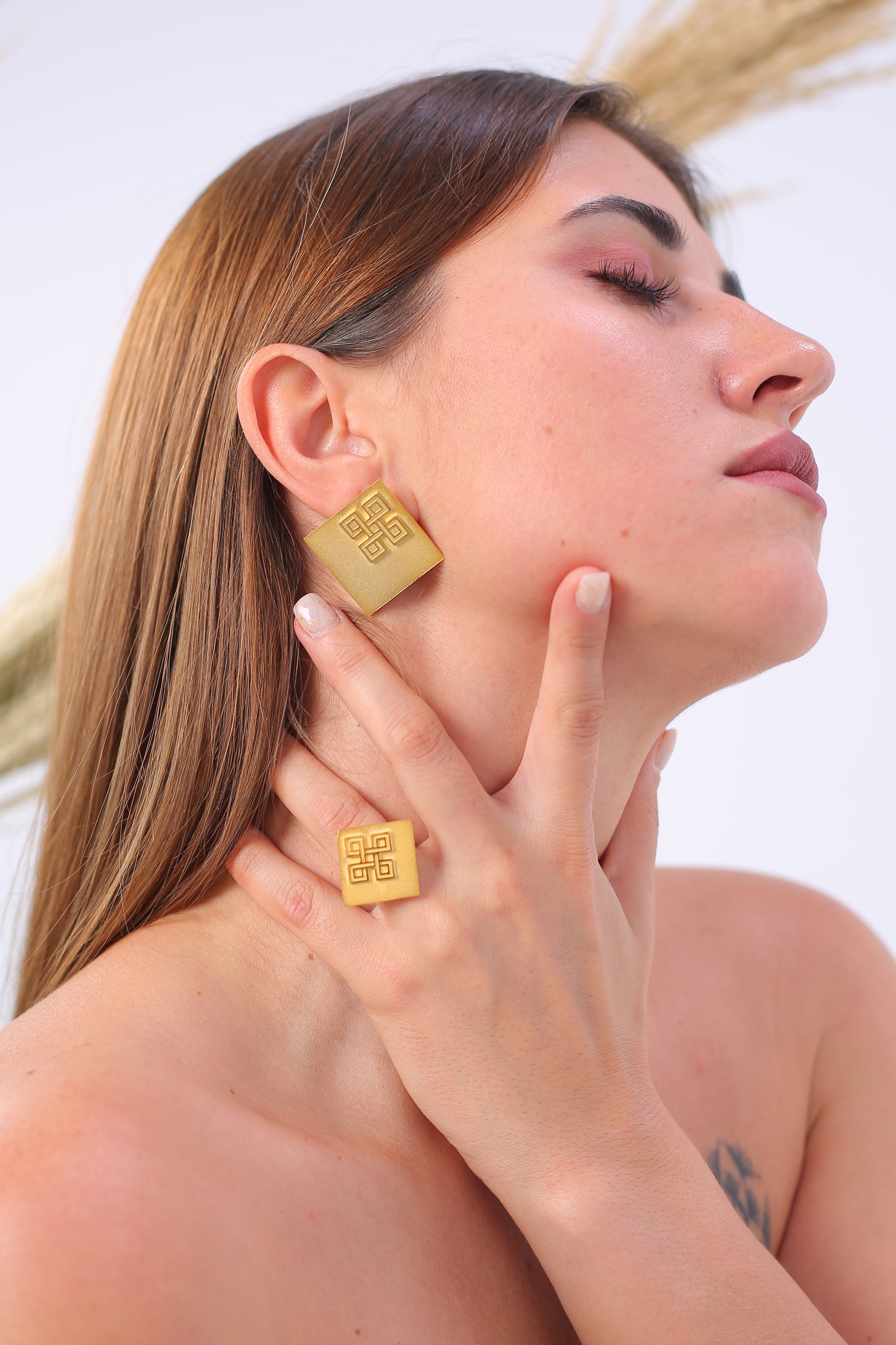 Distinguish your look with a touch of the magic of geometric design with hand-welded layers using techniques and high quality of craftsmanship and excellence, plated with gold.